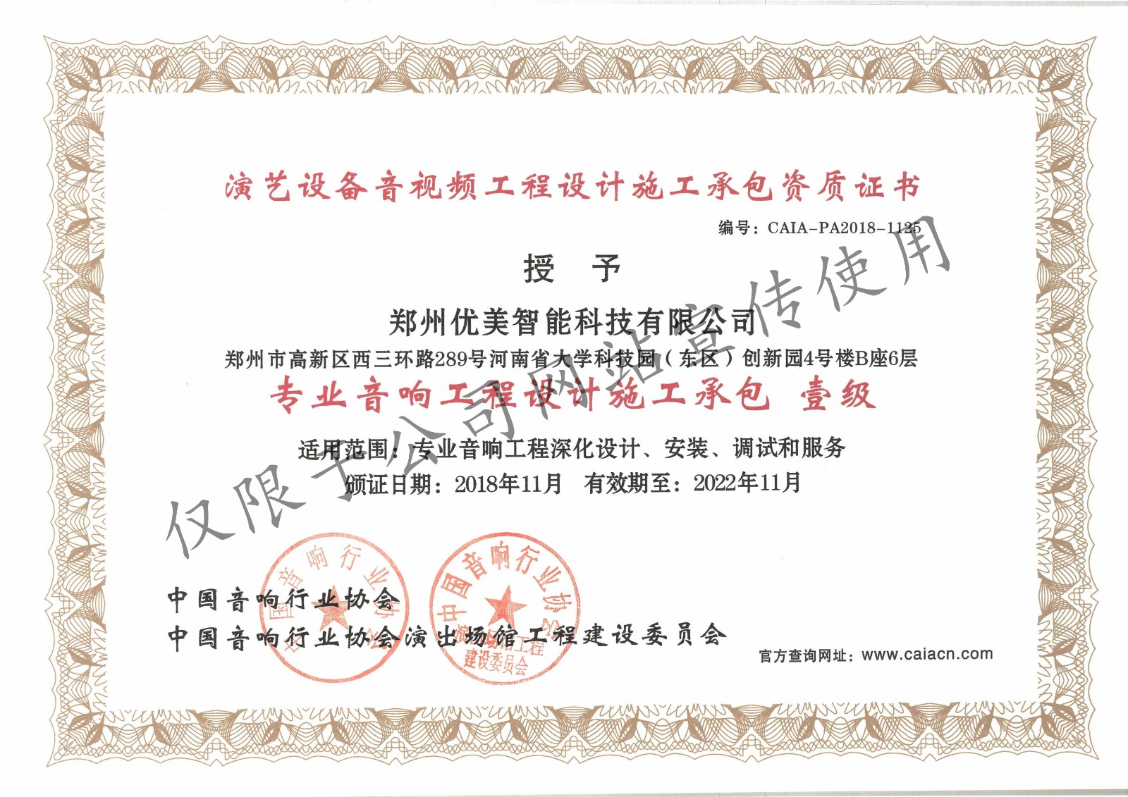 專業(yè)音響工程設計施工承包--壹級資質(zhì)證書
