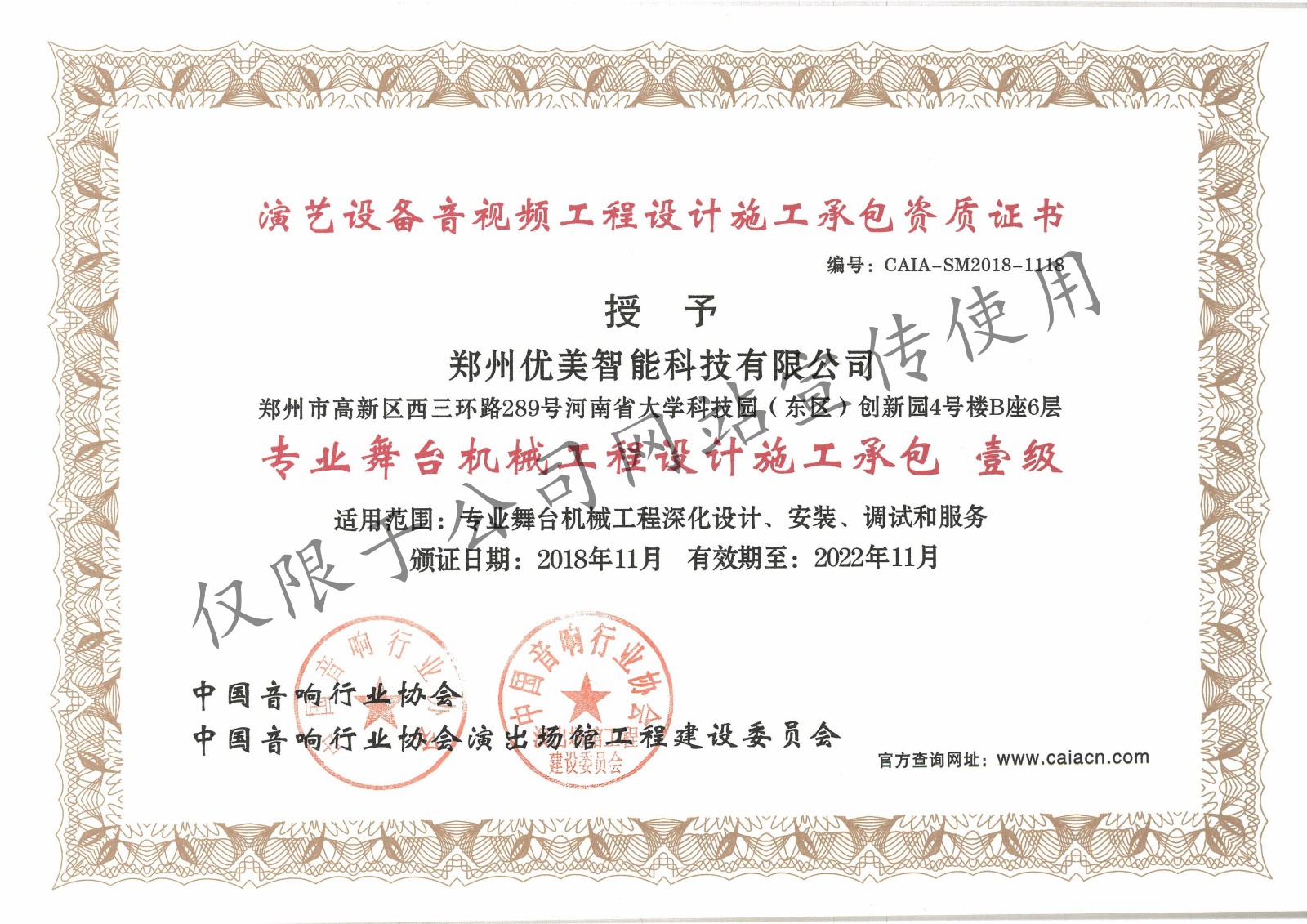 專業(yè)舞臺機械工程設計施工承包--壹級資質(zhì)證書