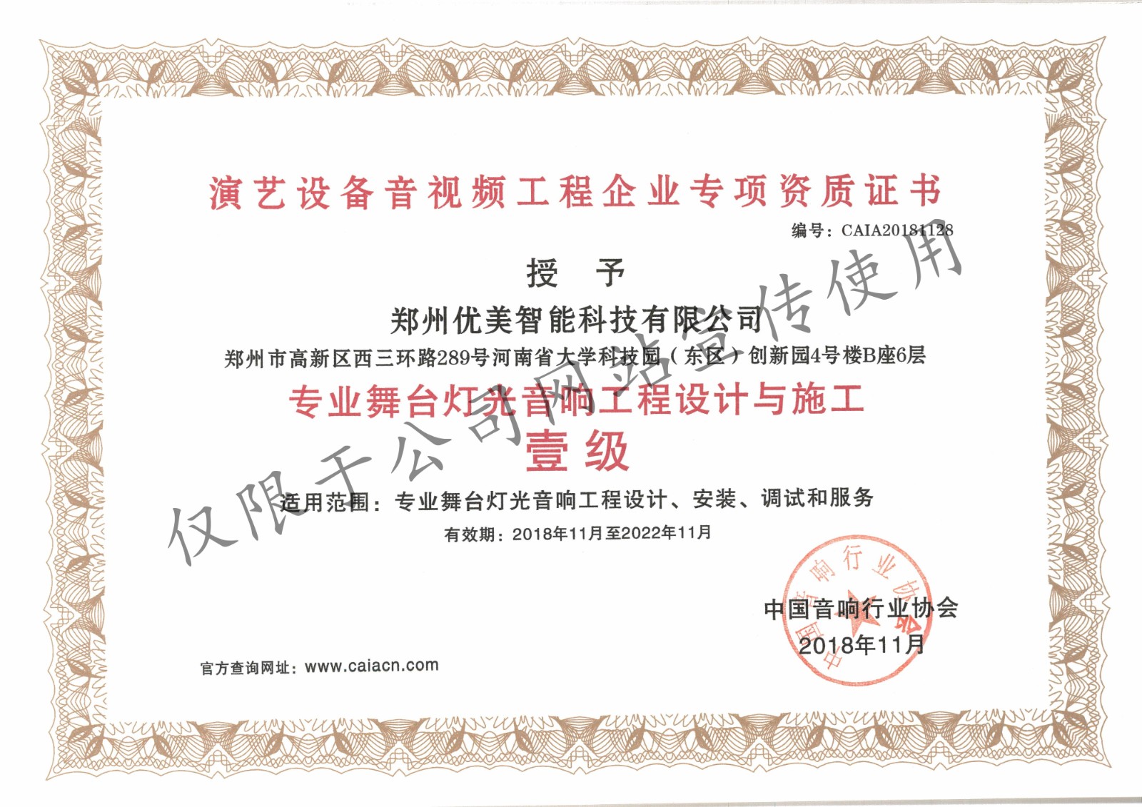 專業(yè)舞臺燈光音響工程設計與施工--壹級資質(zhì)證書