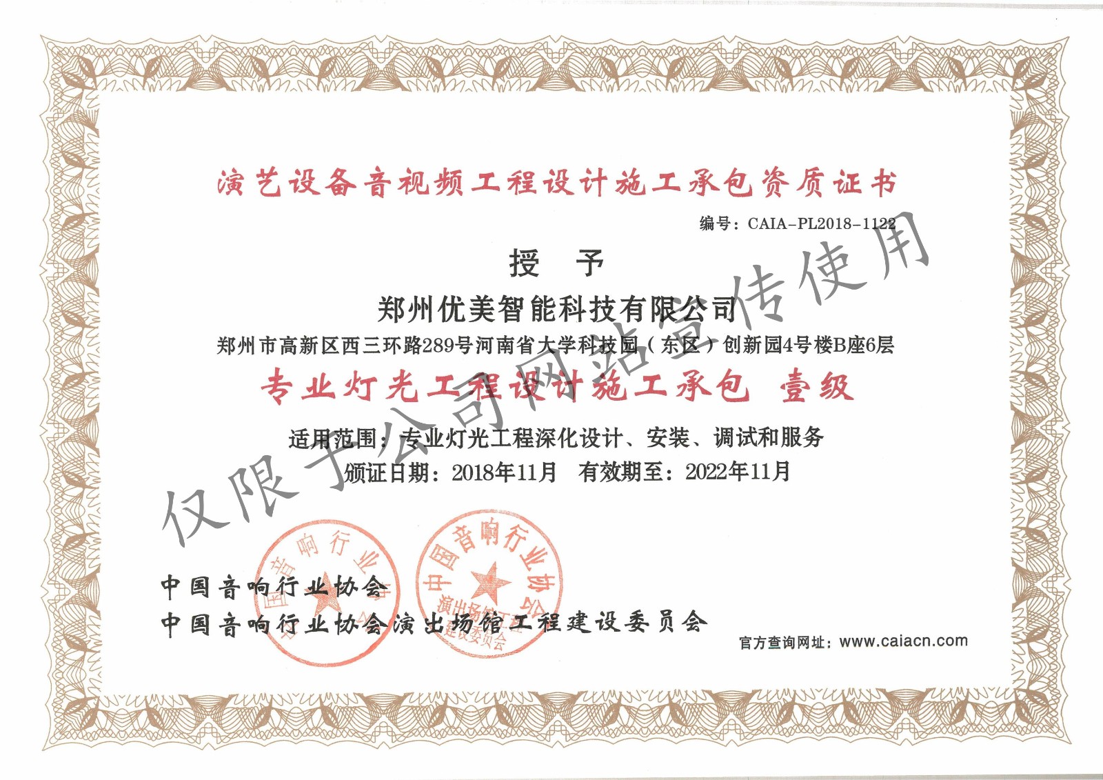 專業(yè)燈光工程設計施工承包--壹級資質(zhì)證書