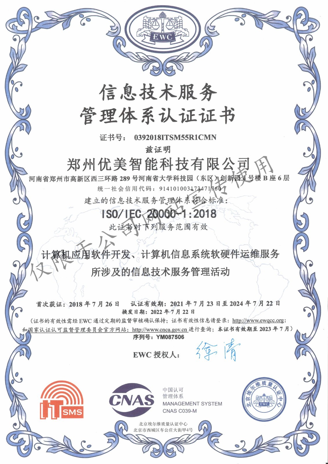 ISO20000信息技術(shù)服務(wù)管理體系認證證書