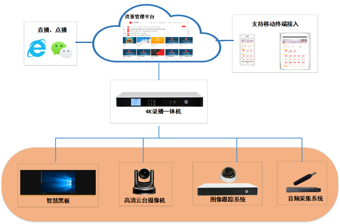 系統(tǒng)主要由智慧黑板子系統(tǒng)、錄播圖像采集子系統(tǒng)、圖像跟蹤子系統(tǒng)、數(shù)字音頻處理子系統(tǒng)、導播子系統(tǒng)及電源控制子系統(tǒng)組成?!耙绘I式”開啟課堂錄制,高清拍攝、專業(yè)音質采集與處理,對整個教學過程進行場景化記錄。實現(xiàn)錄播應用常態(tài)化,快速建設視頻資源。錄制的教學視頻可通過U盤快速拷貝,或設置自動上傳到應用云平臺,為教學資源建設、評課活動等多種應用提供基礎硬件支撐。